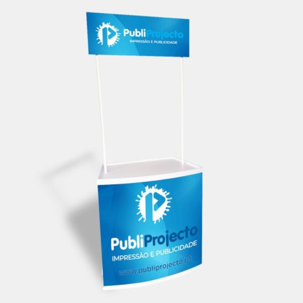 Estrutura versátil, ideal para promover a sua marca em eventos e feiras. Composto por um corpo de plástico e hastes de alumínio. Poderá substituir a imagem futuramente utilizando sempre a mesma bancada.