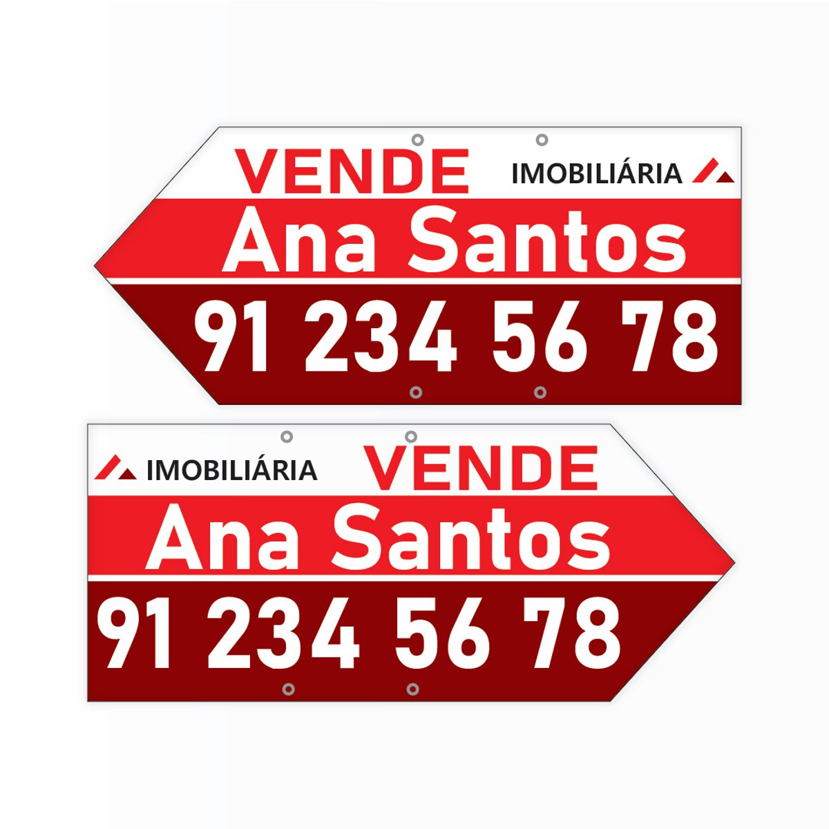 Placa PPA de 3,5mm em formato de seta (caso queira espessura superior, favor solicitar orçamento), tamanho 70x30cm, podem ter vinil impresso na frente e no verso da placa. Já estão incluídas ilhóses prateadas de Nickel de 12mm.
